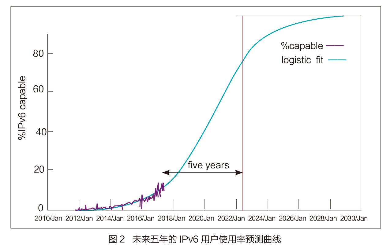 我们用这个曲线来看全球IPv6的发展情况,如图2所示。可以发现,IPv6很快将进入快速发展阶段,从现在起到接下来的一两年将是快速发展期,并且,可以预见的是,未来5年时间里,全球IPv6用户的占比将达到75%~80%,这个曲线会一直向上,并接近百分之百。尽管这只是乐观增长曲线的预测,但是,至少接下来的5年时间里,全球范围的IPv6都将快速发展。
