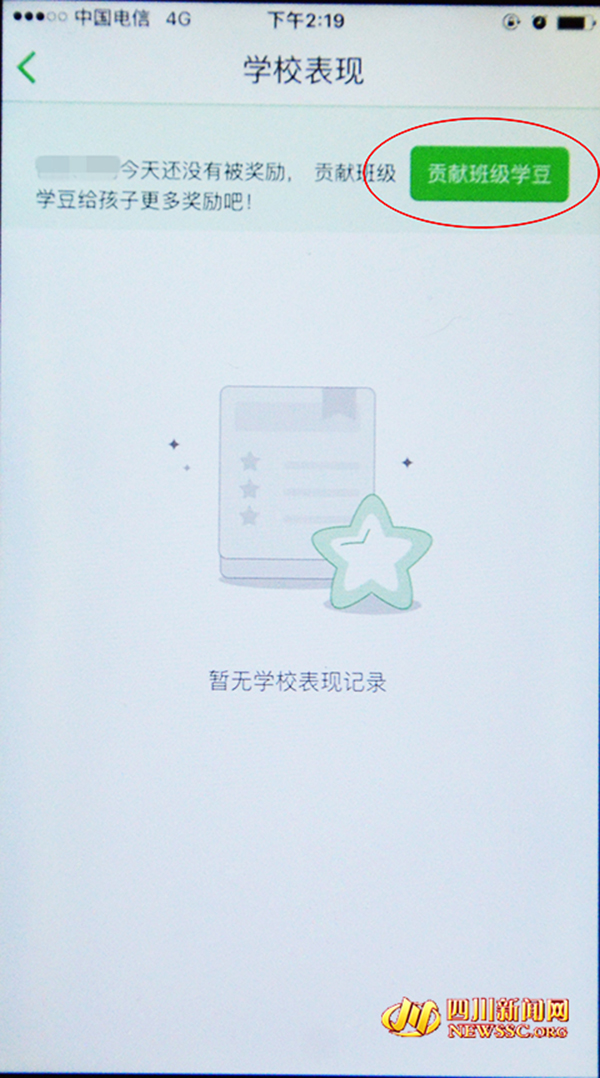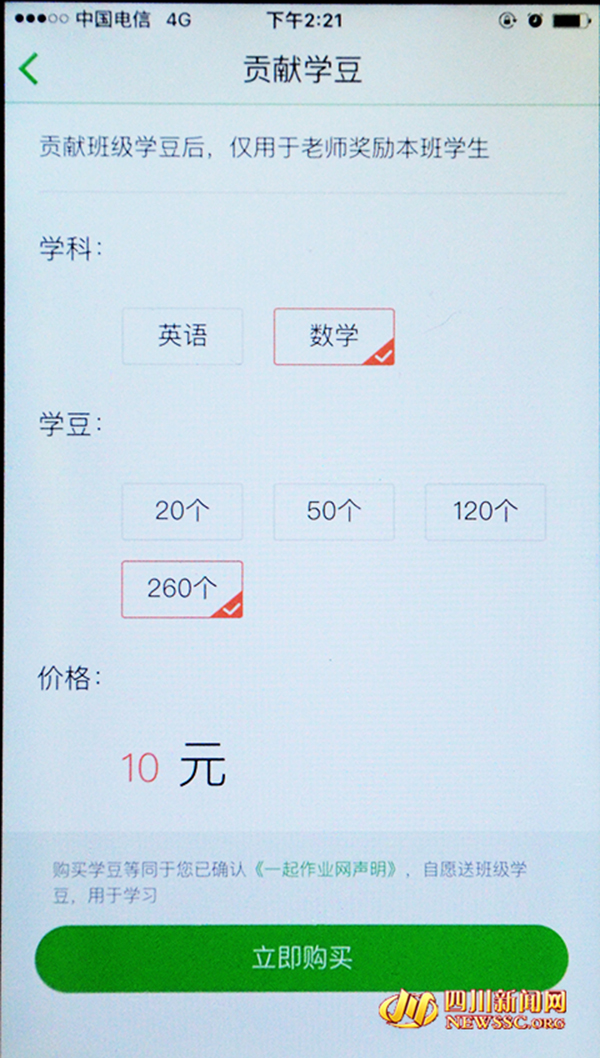 王先生告诉四川新闻网记者,他在使用“一起作业家长端”的时候还发现,在其中一个名为“学校表现”的栏目中有这样一个提示——“xxx今天还没有被奖励,贡献班级学豆给孩子更多奖励吧!”。只要点击“贡献班级学豆”,马上就会出一个充值页面,里面可以分别购买20、50、120、260个的学豆,价格分别为1、2、5、10元。