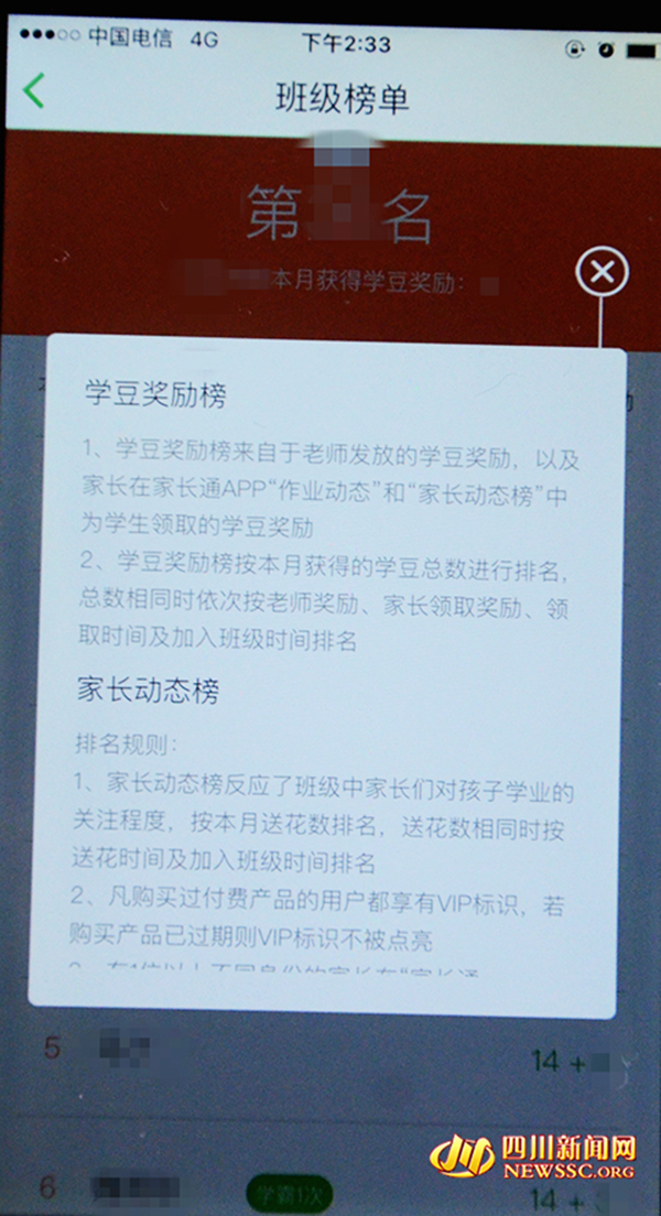 针对王先生所说的情况,四川新闻网记者随即对“一起作业家长端”进行了实际操作。家长端APP软件页面被分为消息、教育资讯、成长、去学习四大板块,在成长板块中有两个榜单,根据榜单介绍,其中“学豆奖励榜”中的学豆获取分别是老师的奖励,以及家长在APP“作业动态”和“家长动态榜”中为学生领取,排名为学生本月获取的学豆总数。而另一个“家长动态榜”,是按照本月家长为老师送的“鲜花”数量来进行排名。