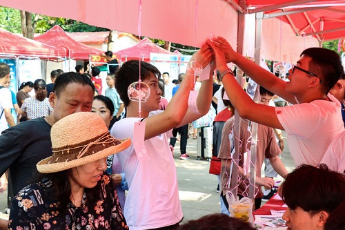 迎新人员与新生共同将祝福挂在这里,同时,还有四年光阴。摄影/郝磊
