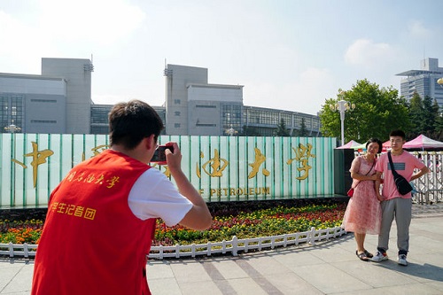 学生记者帮助新生留下新生和母亲与石大的合影。摄影/石庆毅