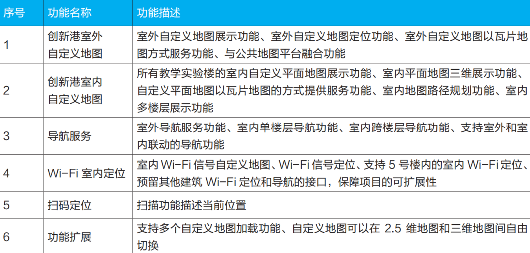 用户服务端包括创新港校区建筑道路地图展示、创新港校区室外地图导航服务、创新港校区室内建筑各个楼层平面图展示、创新港校区室内地图导航服务、创新港校区VR全景导览。
