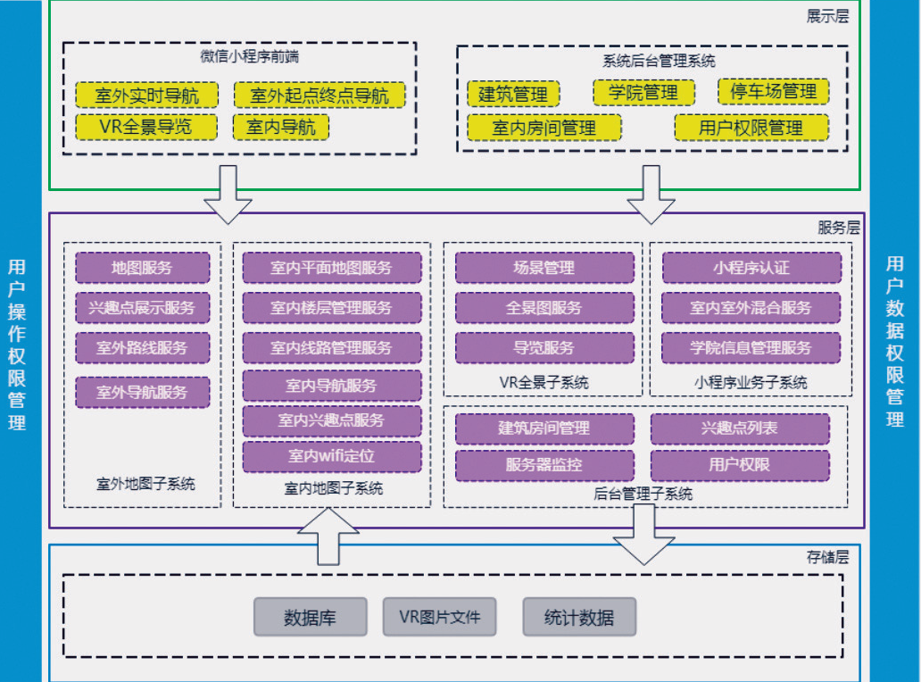 服务层主要是对外提供基础功能服务,包含小程序业务子系统、室外地图子系统、室内地图子系统、VR全景子系统、后台管理子系统五个子系统模块。