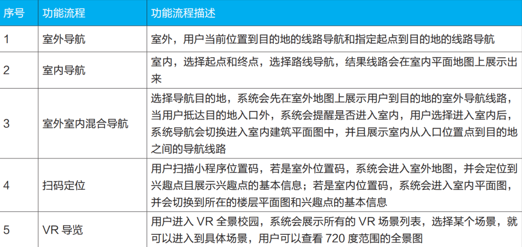 校园导航系统总体功能流程主要分为以下五种:室外导航流程、室内导航流程、室外室内混合导航流程、扫码定位流程、VR导览流程。具体功能描述见表2。