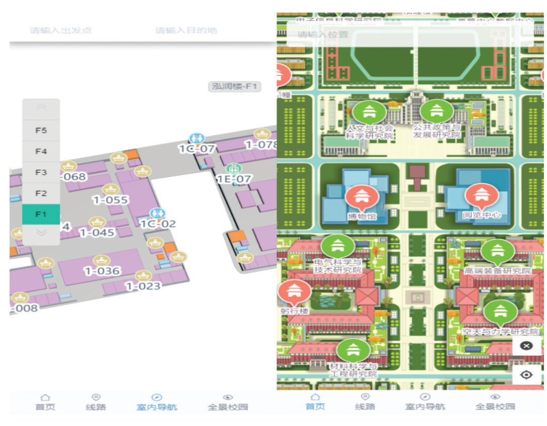 校园导航系统(图3)根据创新港校区的实际环境实现了室内、室外自定义地图展示,对创新港校区所有路网、建筑物室内、外地图的全覆盖,通过系统可以了解创新港校区内所有建筑物以及景观。