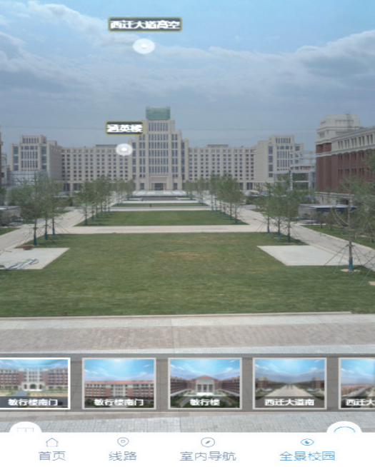 系统还具有室外路径实时导航、室内路径导览、校园VR全景地图(图4)以及会议导航等功能,极大地丰富了校园地图系统功能的多样性,能够满足不同用户的不同需求。