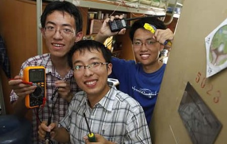 复旦大学“科技宅男”寝室成员在寝室门口面对记者镜头摆pose(姿势)合影。另一位室友因为在上课,遗憾缺席。