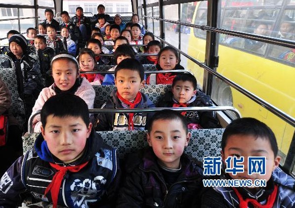 资料图:山东邹平县范公小学的学生乘坐校车准备回家。